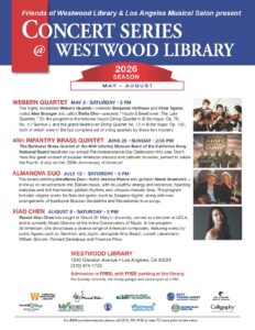 Concerts last approximately 90 minutes. Saturday concerts take place upstairs in the library while the library is open for regular business. For ADA accommodations, please call 213-228-7430 at least 72 hours prior to the event.
