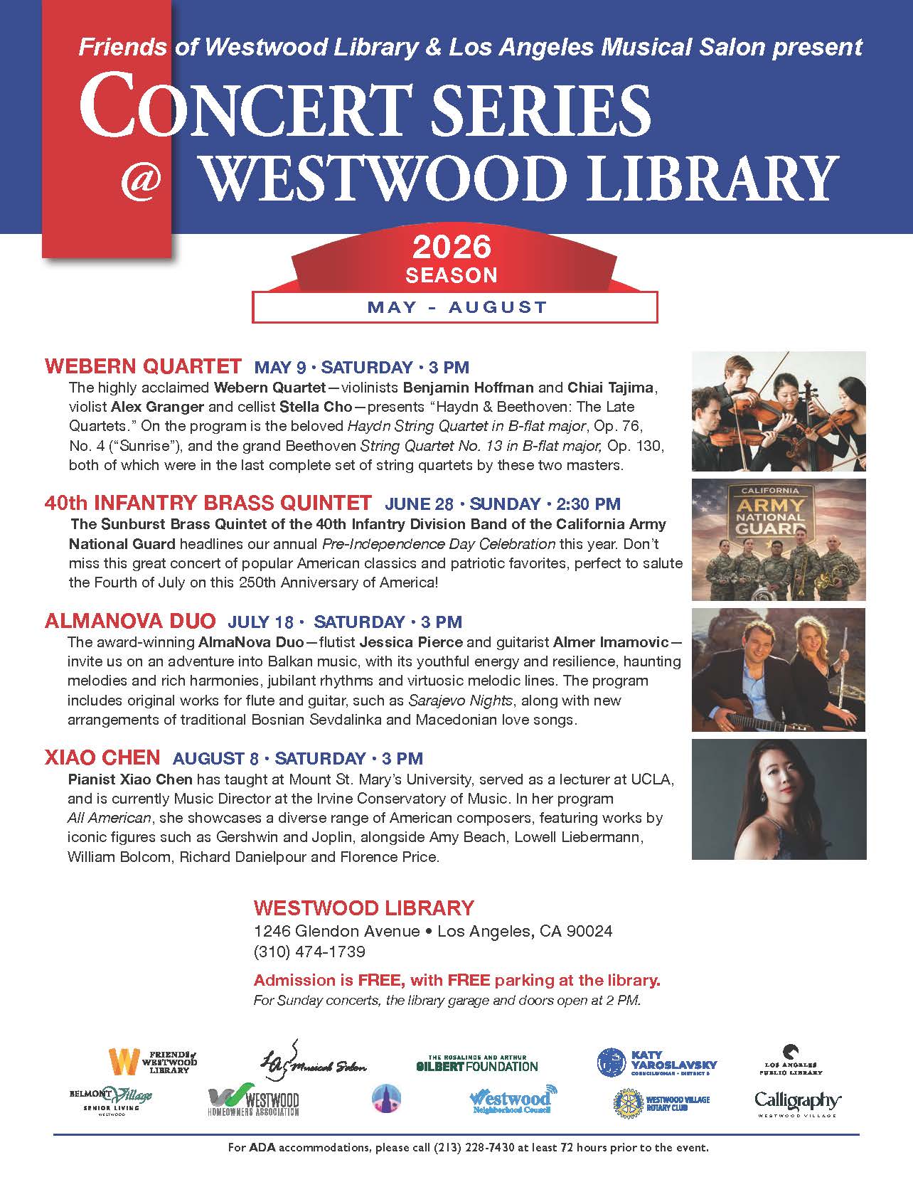 Although our Concert Series @ Westwood Library is free to the public, that does not mean it is without cost. Your tax-deductible membership dues, donations and sponsorships help make these wonderful programs a reality.